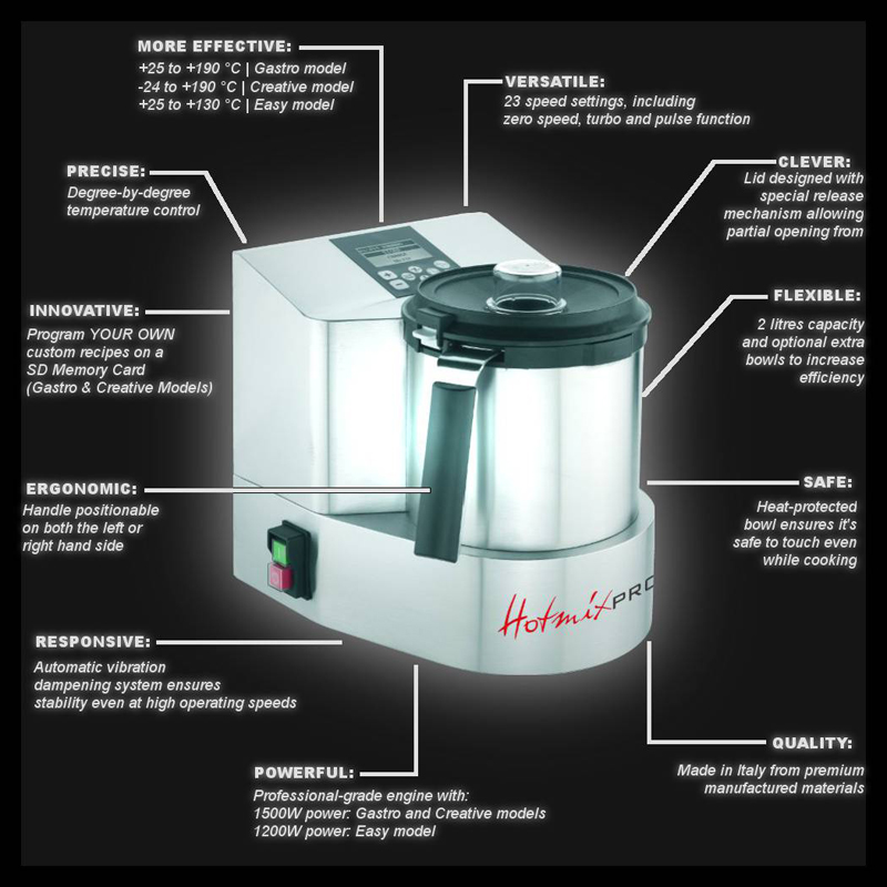 Mevcut normlara uygun olarak besin ile ilgili her türlü parça, hizli ve hassas bir temizleme için kolaylikla sökülebilir. YARATICI VE KÂRLI!HotmixPRO Easy, benzersiz randimani sayesinde sefin yaraticiligini gelistirir, harici ekipmanlara para harcama geregini ortadan kaldirarak ve mutfakta personel kullanimini azaltarak tasarruf yapmaniza olanak saglar.